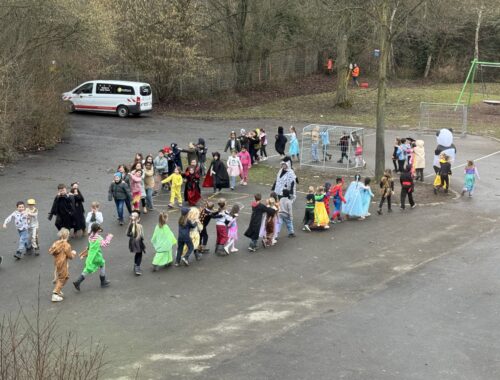 Auch in diesem Jahr feierte die ganze Schule den Karneval. Viele Kinder und Erwachsene feierten verkleidet in den Klassen. Um 10.10 Uhr startete die Polonaise der ganzen Schule. Sie endete in der Sporthalle. Dort wurde noch bis 11.11 Uhr gefeiert.