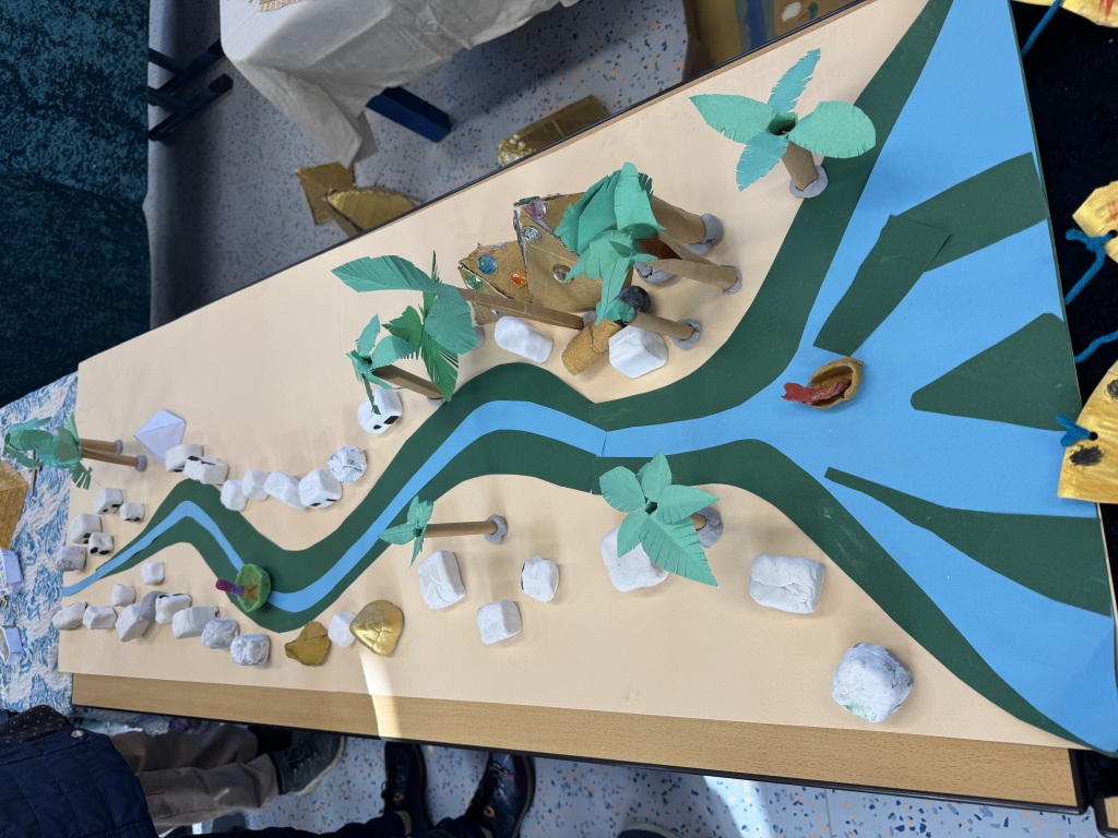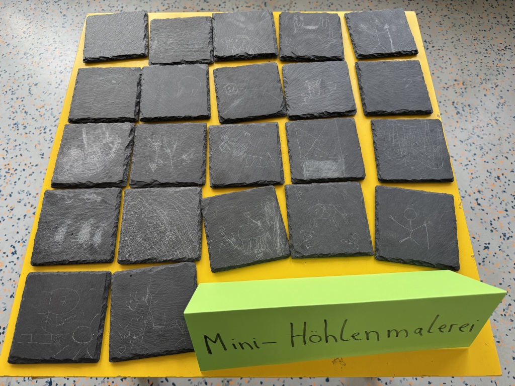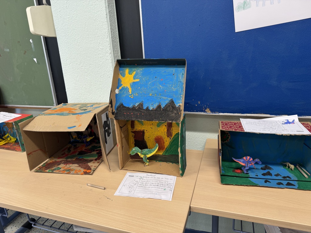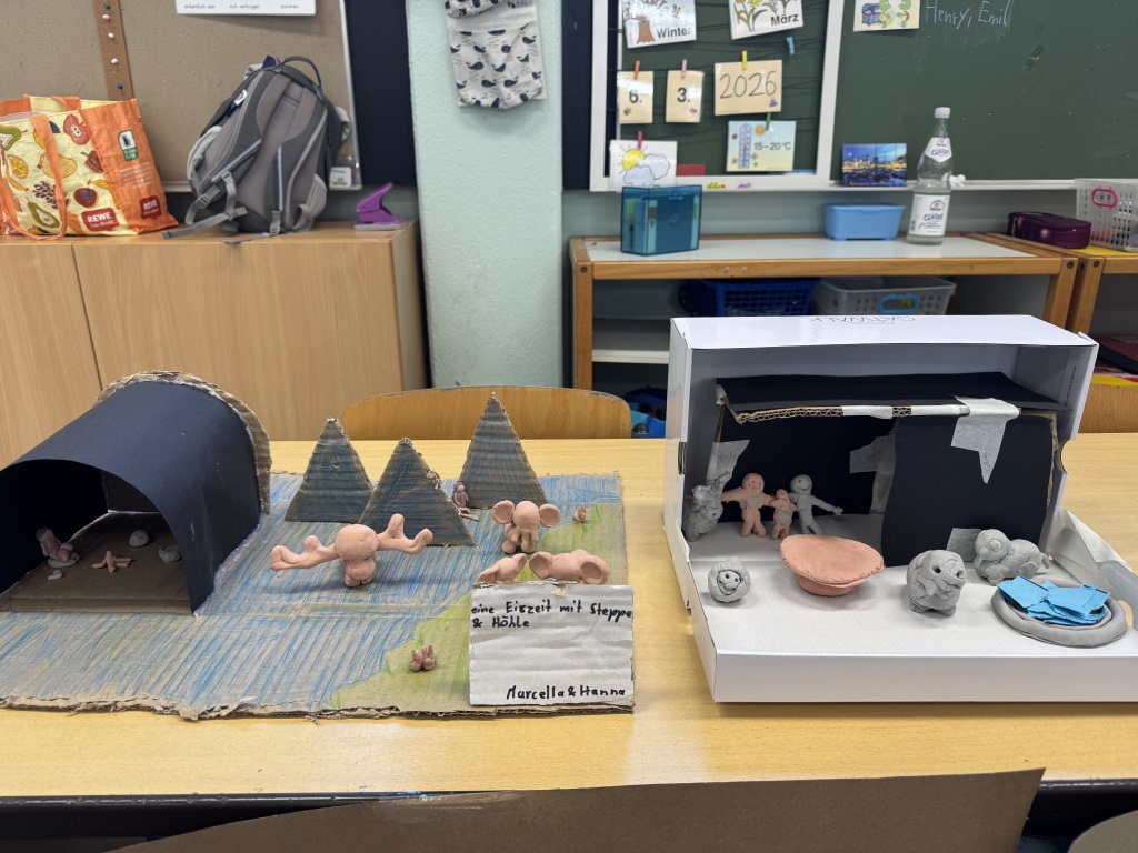In der spannenden Projektwoche konnten wurden die Kinder in jahrgangsübergreifende Gruppen eingeteilt und konnten das Thema wählen. Unter dem Motto „Eine Reise durch die Zeit“ gab es mehrere Schwerpunkte wie Mittelalter, Römer, Schule früher, Schule der Zukunft, Eiszeit, Dinosaurier, alte Ägypten, Steinzeit. Am Freitag fand eine Präsentation der vielen unterschiedlichen Ergebnisse statt. Die Gruppe „Schule früher“ mit Fräulein Lehrerin Ruck führte ein kleines Theaterstück auf.